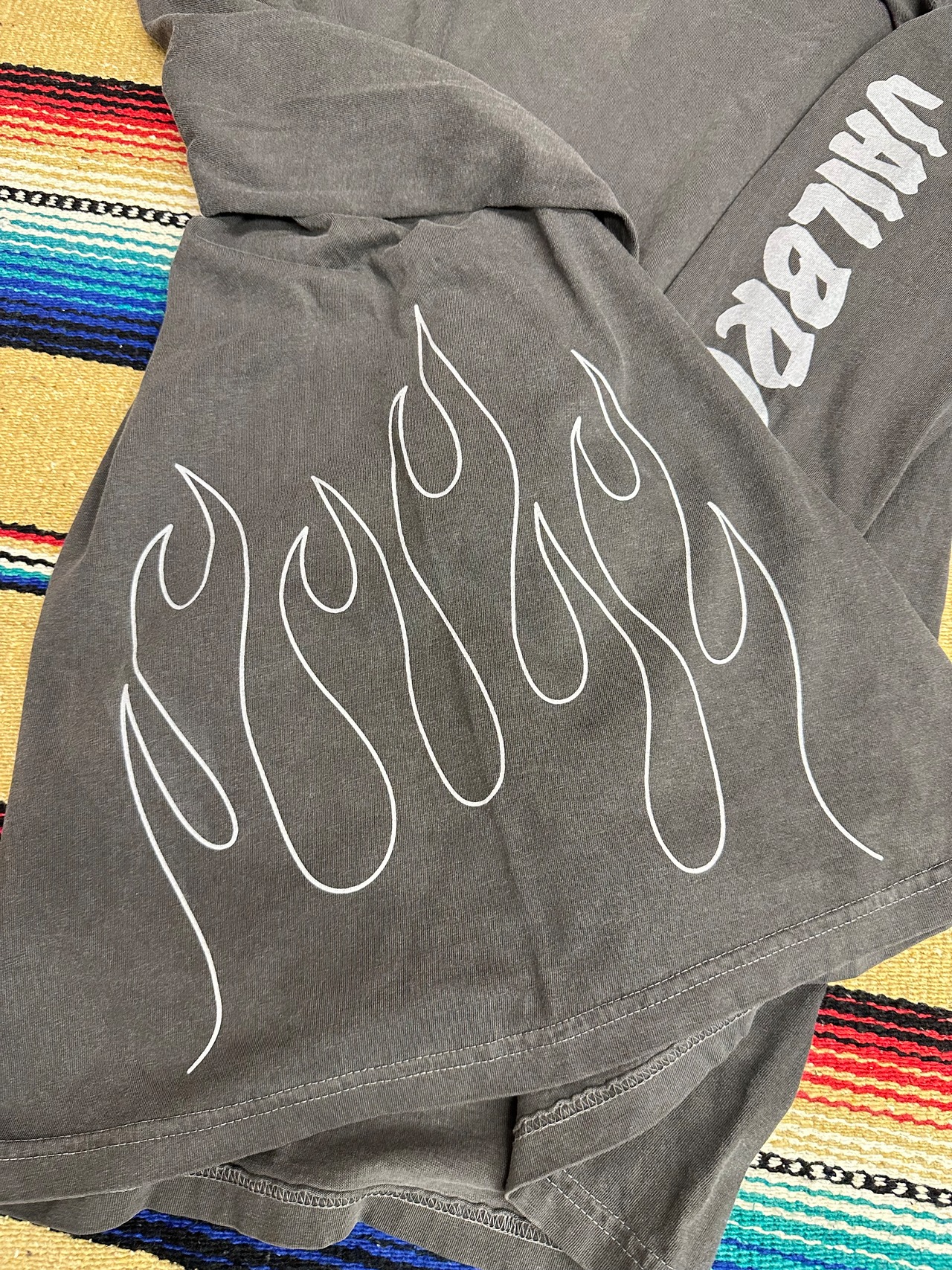 50回ほど洗いをかけたロンTに左袖に手描きフォント、右脇腹にファイヤーパターンをぷりんとしました。